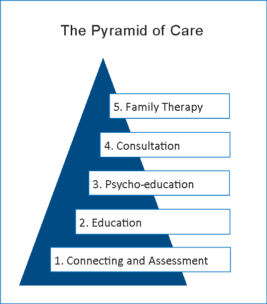 The Pyramid of Family care has five hierarchical levels of activities for meeting the support needs of family caregivers. The intensity of intervention increases as you move up the pyramid, while the number of family caregivers who are likely to require the intervention decreases.